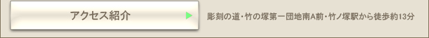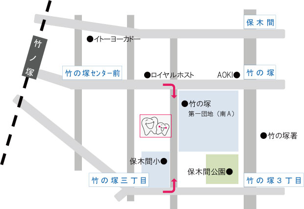 竹ノ塚駅からまっすぐ道なりに進み、竹の塚図書館を通過、竹ノ塚グランドホテルを通過、ロイヤルホストを通過し、駅のロータリーから4つ目の信号を駅を背にして 右折します。泉湯を通過し、竹の塚第一団地南-A前(竹の塚彫刻の道)のモニュメントの前に当医院があります。